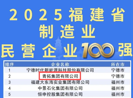 會上發布了2025福建省民營企業100強、制造業民營企業100強、服務業民營企業100強、創新型民營企業100強四個榜單,其中,青拓集團憑借其卓越的經營業績和強大的綜合實力,再次脫穎而出,榮獲福建省民營企業100強第二名和制造業民營企業100強第二名的優異成績。