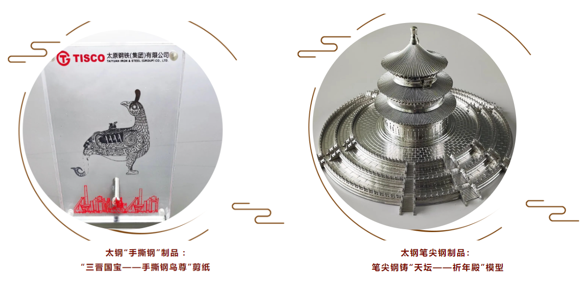 據了解,此展品分別是太鋼“手撕鋼”制品 ——“三晉國寶——手撕鋼鳥尊”剪紙,太鋼筆尖鋼制品——筆尖鋼鑄“天壇——祈年殿”模型。